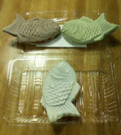 チョコレート、抹茶、粒あん。家族へのお土産も込み。近くに新規オープンしたお店のメニューで、粒あん以外は限定商品なんだそうです。抹茶のたいやき(緑)、ギリギリで最後のひとつでした……黒ごまのたいやき(黒)はやっぱり売り切れてて買えなかった! さすが限定メニュー……orz